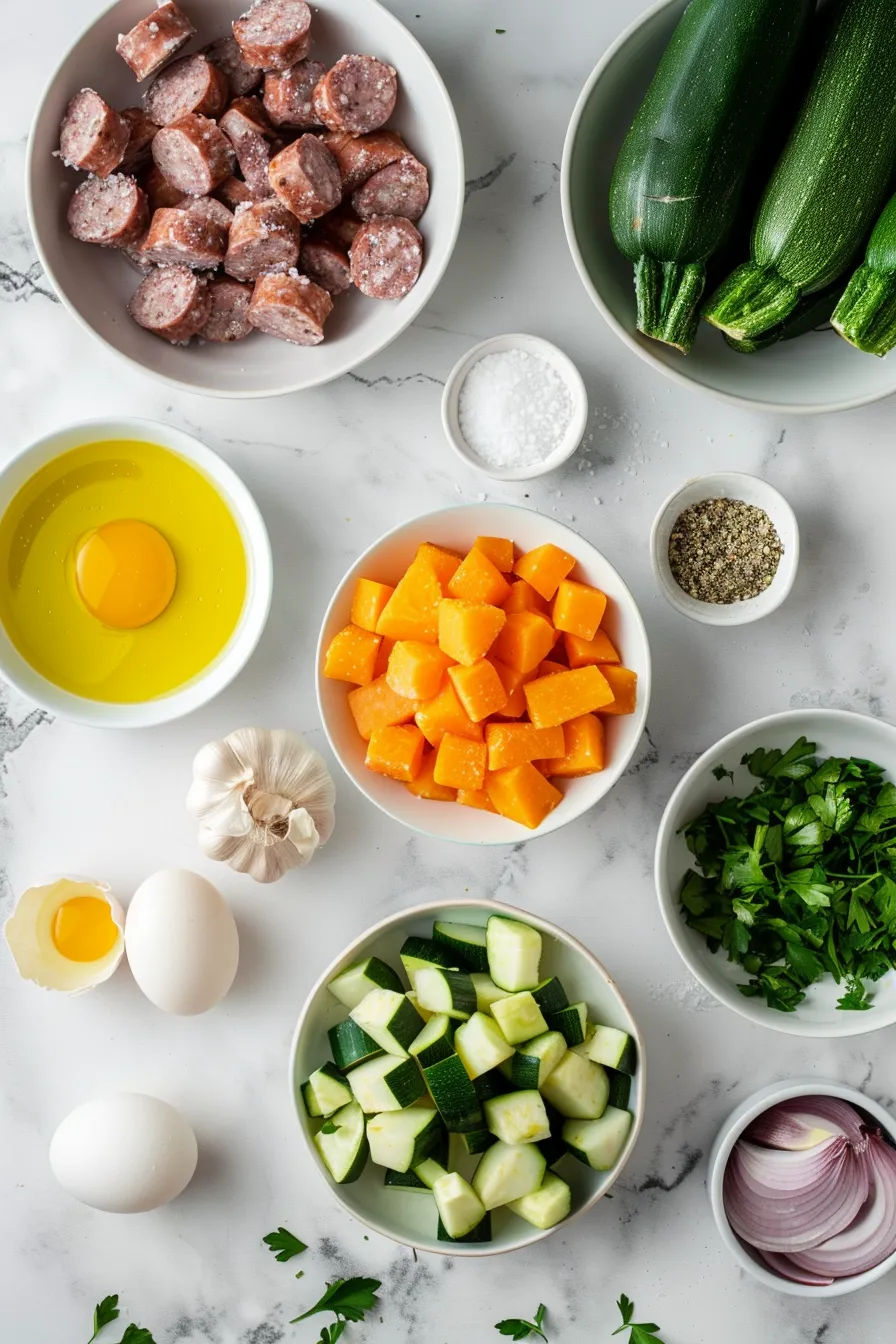 - Sweet Potato: 1 medium, diced into 1/2 inch cubes; adds a natural sweetness that complements the salty sausage.